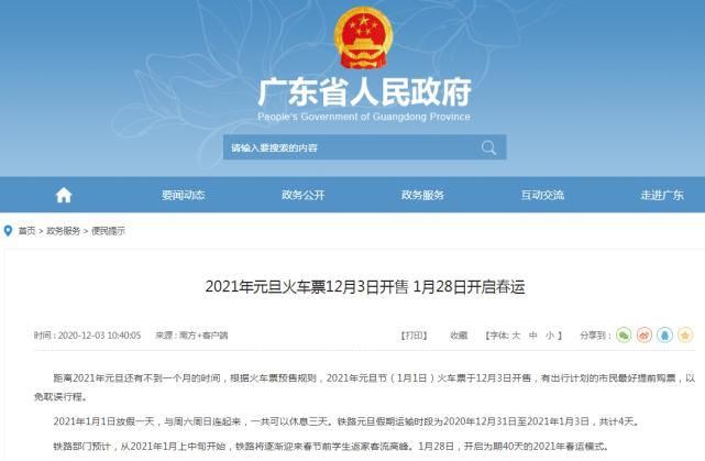 事實(shí)上,12月3日,廣東省人民政府官網(wǎng)上發(fā)布了《2021年元旦火車票12月3日開售 1月28日開啟春運(yùn)》一文,文章中明確表示 “1月28日,開啟為期40天的2021年春運(yùn)。”